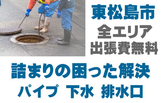 東松島市で排水つまり、トイレ詰まり、シンクつまりなどの排水トラブルはお任せください。店舗の厨房、グリストつまりも対応しております。配管つまり、マンホールの溢れ、下水の臭い、排水管のトラブルは最短15分到着!